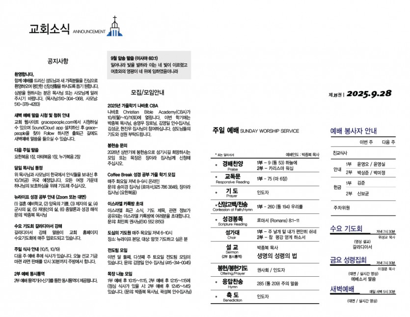 교회안내 Church Guide 주보 2025년 9월 28일 주보 페이지 정보 작성자 뉴라이프교회 작성일25-09-28 관련링크 이전글 다음글 목록 본문 . 이전글 다음글 목록 New Life Church 4130 Technology Place, Fremont, CA 94538 | TEL : 510-657-9191 FAX : 510)657-1004 Copyright© New Life Church All rights reserved. Provided by
