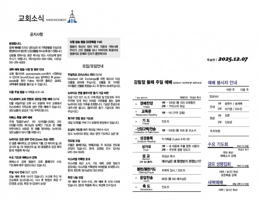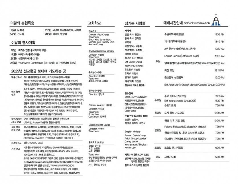 교회안내 Church Guide 주보 2025년 12월 7일 주보 페이지 정보 작성자 뉴라이프교회 작성일25-12-07 관련링크 이전글 다음글 목록 본문 . 이전글 다음글 목록 New Life Church 4130 Technology Place, Fremont, CA 94538 | TEL : 510-657-9191 FAX : 510)657-1004 Copyright© New Life Church All rights reserved. Provided by