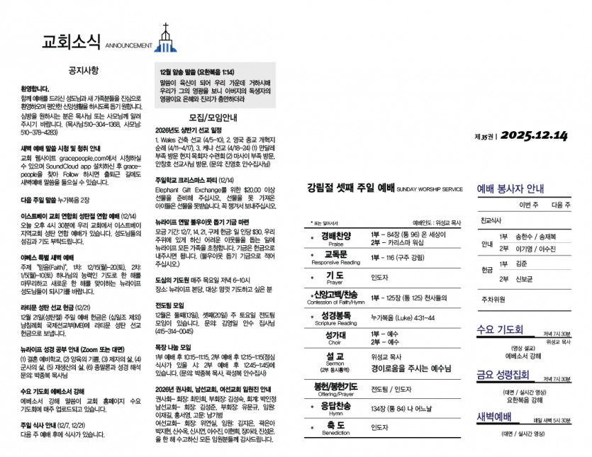 교회안내 Church Guide 주보 2025년 12월 14일 주보 페이지 정보 작성자 뉴라이프교회 작성일25-12-14 관련링크 이전글 다음글 목록 본문 . 이전글 다음글 목록 New Life Church 4130 Technology Place, Fremont, CA 94538 | TEL : 510-657-9191 FAX : 510)657-1004 Copyright© New Life Church All rights reserved. Provided by
