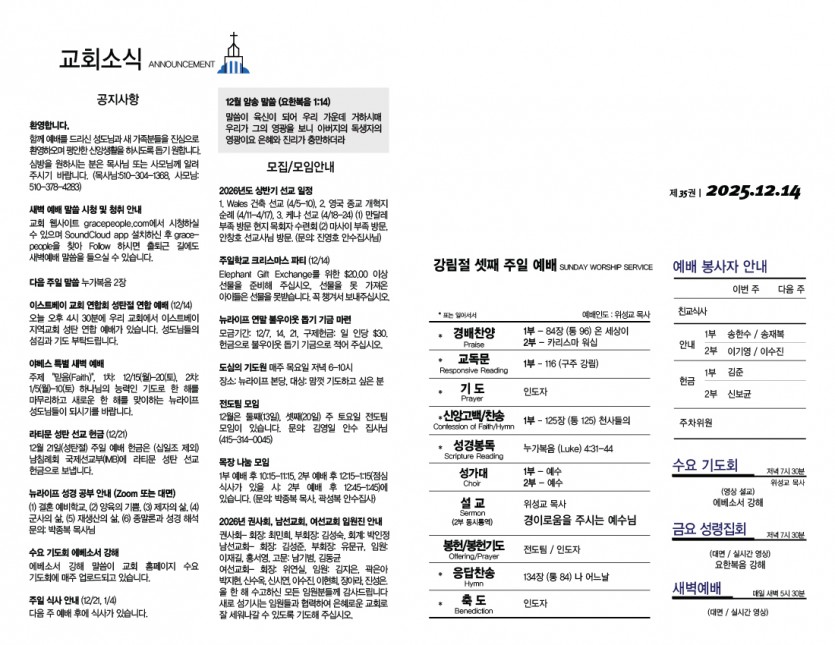 교회안내 Church Guide 주보 2025년 12월 14일 주보 페이지 정보 작성자 뉴라이프교회 작성일25-12-14 관련링크 다음글 목록 본문 . 다음글 목록 New Life Church 4130 Technology Place, Fremont, CA 94538 | TEL : 510-657-9191 FAX : 510)657-1004 Copyright© New Life Church All rights reserved. Provided by