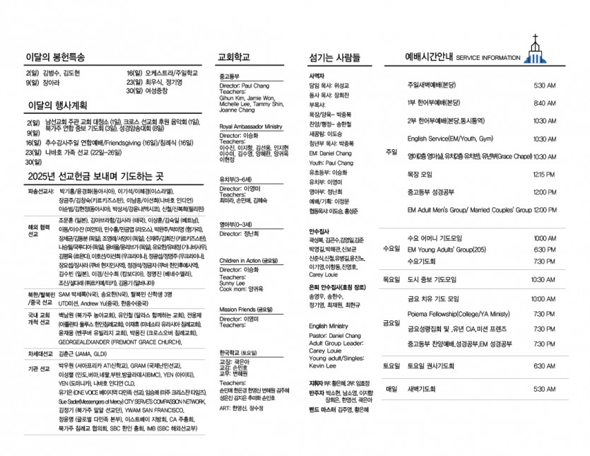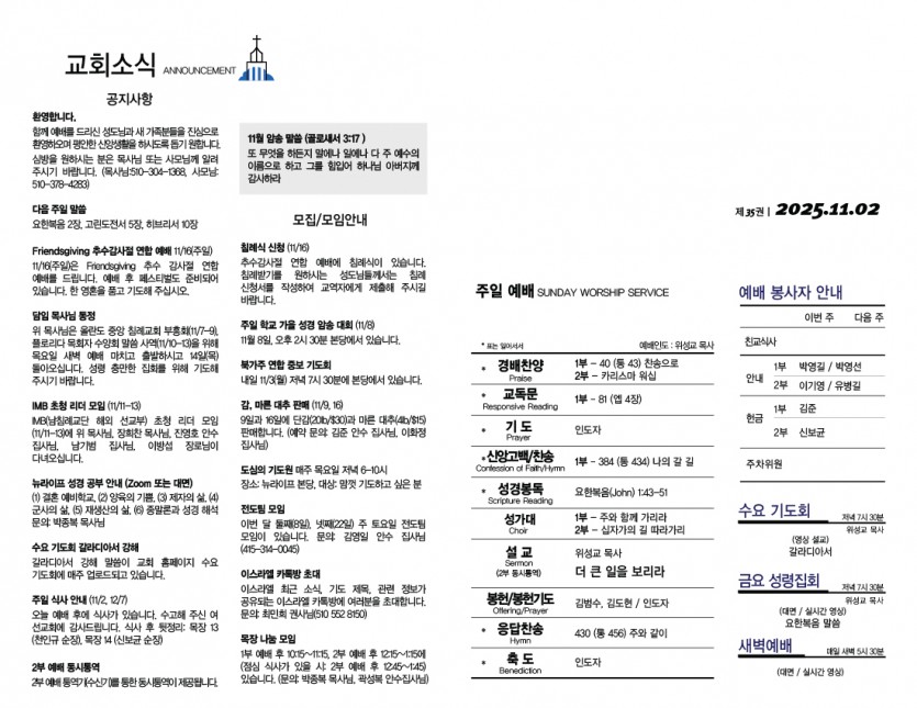 교회안내 Church Guide 주보 2025년 11월 2일 주보 페이지 정보 작성자 뉴라이프교회 작성일25-11-02 관련링크 다음글 목록 본문 . 다음글 목록 New Life Church 4130 Technology Place, Fremont, CA 94538 | TEL : 510-657-9191 FAX : 510)657-1004 Copyright© New Life Church All rights reserved. Provided by