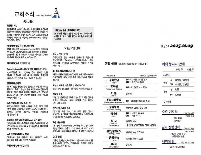 교회안내 Church Guide 주보 2025년 11월 9일 주보 페이지 정보 작성자 뉴라이프교회 작성일25-11-09 관련링크 다음글 목록 본문 . 다음글 목록 New Life Church 4130 Technology Place, Fremont, CA 94538 | TEL : 510-657-9191 FAX : 510)657-1004 Copyright© New Life Church All rights reserved. Provided by