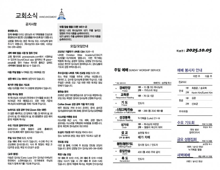 교회안내 Church Guide 주보 2025년 10월 5일 주보 페이지 정보 작성자 뉴라이프교회 작성일25-10-05 관련링크 다음글 목록 본문 . 다음글 목록 New Life Church 4130 Technology Place, Fremont, CA 94538 | TEL : 510-657-9191 FAX : 510)657-1004 Copyright© New Life Church All rights reserved. Provided by