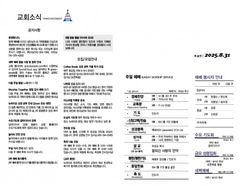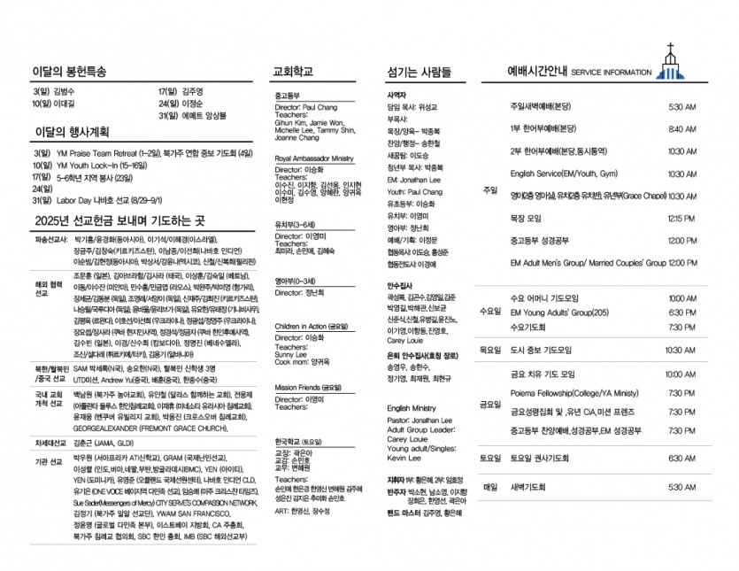 교회안내 Church Guide 주보 2025년 8월 31일 주보 페이지 정보 작성자 뉴라이프교회 작성일25-08-31 관련링크 이전글 다음글 목록 본문 . 이전글 다음글 목록 New Life Church 4130 Technology Place, Fremont, CA 94538 | TEL : 510-657-9191 FAX : 510)657-1004 Copyright© New Life Church All rights reserved. Provided by