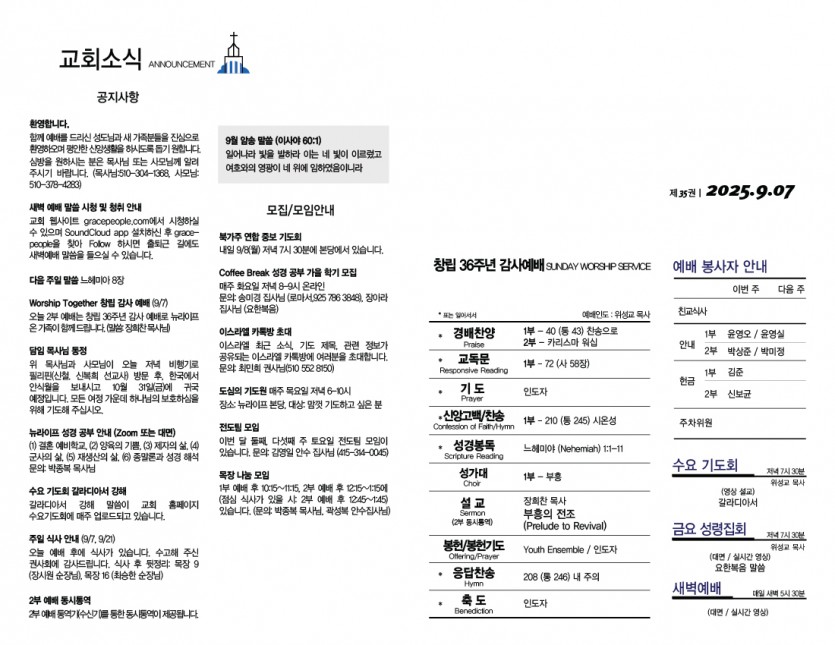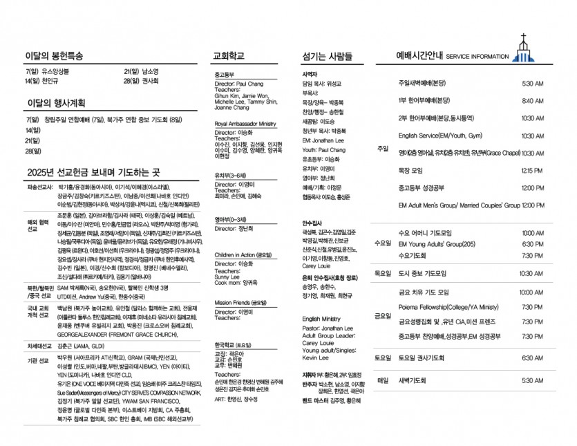 교회안내 Church Guide 주보 2025년 9월 7일 주보 페이지 정보 작성자 뉴라이프교회 작성일25-09-07 관련링크 이전글 다음글 목록 본문 . 이전글 다음글 목록 New Life Church 4130 Technology Place, Fremont, CA 94538 | TEL : 510-657-9191 FAX : 510)657-1004 Copyright© New Life Church All rights reserved. Provided by
