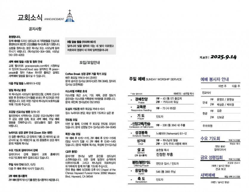 교회안내 Church Guide 주보 2025년 9월 14일 주보 페이지 정보 작성자 뉴라이프교회 작성일25-09-14 관련링크 이전글 다음글 목록 본문 . 이전글 다음글 목록 New Life Church 4130 Technology Place, Fremont, CA 94538 | TEL : 510-657-9191 FAX : 510)657-1004 Copyright© New Life Church All rights reserved. Provided by